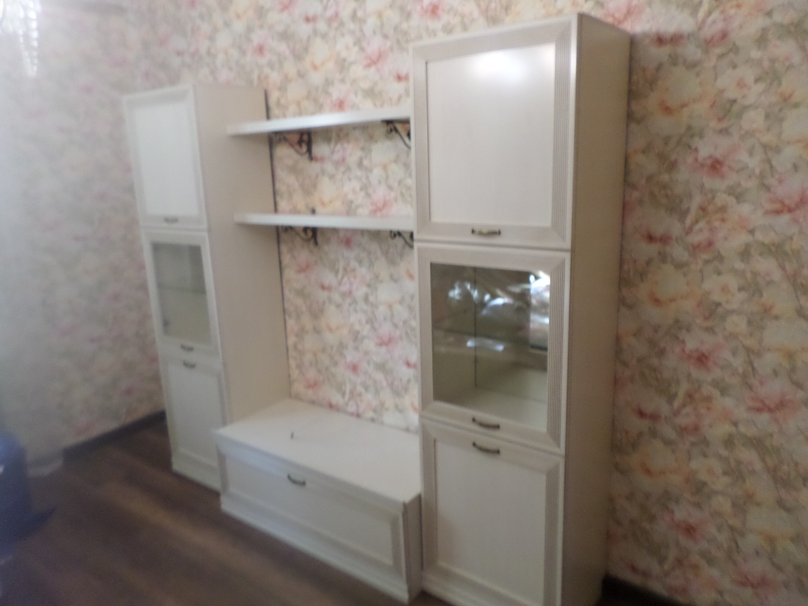- На задних стенках шкафов со стеклянными вставками есть зеркала. Это помогает зрительно расширить комнату.
