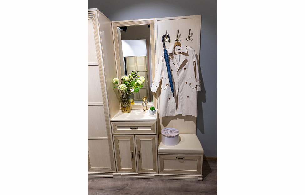 - Адажио — образец сдержанности и изящества, стиля и элегантности. Мебель из коллекции подойдет не только к классическим интерьерам, но и к прихожим в стилях фьюжн, контемпорари и эклектика;