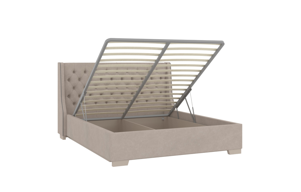 Кроватное основание состоит из прочной металлической рамы и упругих березовых ламелей, обеспечивающих ортопедический эффект. Модель оснащена подъемным механизмом газлифтом и вместительным отсеком для белья. Габариты спального места составляют 160 x 200 см с максимально допустимой нагрузкой на одну сторону в 120-150 кг.