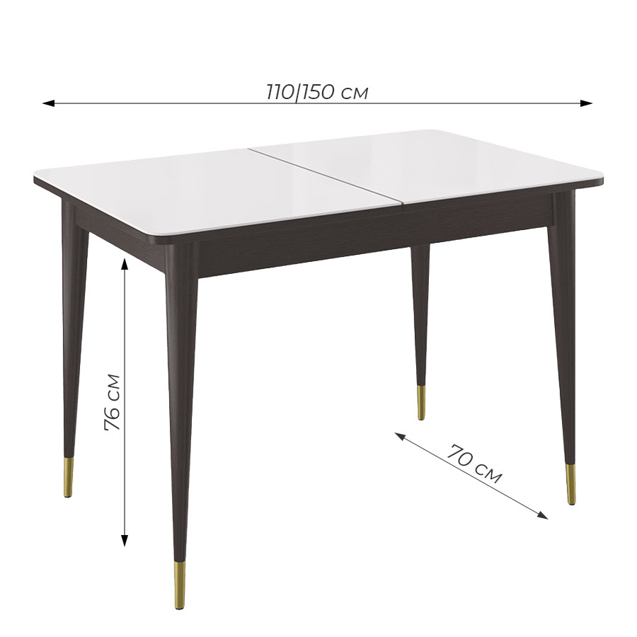 Стол обеденный Мане прямоугольный раздвижной К1100 опоры цвета венге с металлическими наконечниками, столешница - стекло белое глянец.