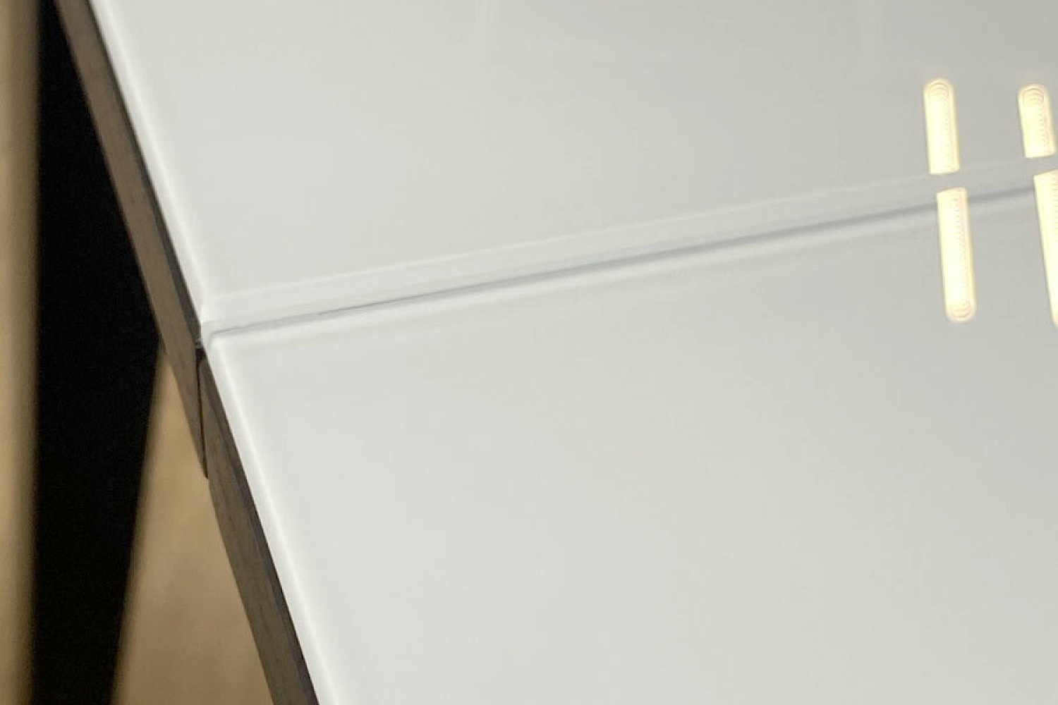 Столешница из стекла надежно защищает стол от влаги и горячего. Для данного стола применяется дорогое, просветленное стекло optiwhite которое передает чистый, яркий цвет без зеленого бутылочного оттенка. Стекло надежно крепится к подложке из ЛДСП на герметик, распределенный по всей поверхности столешницы.