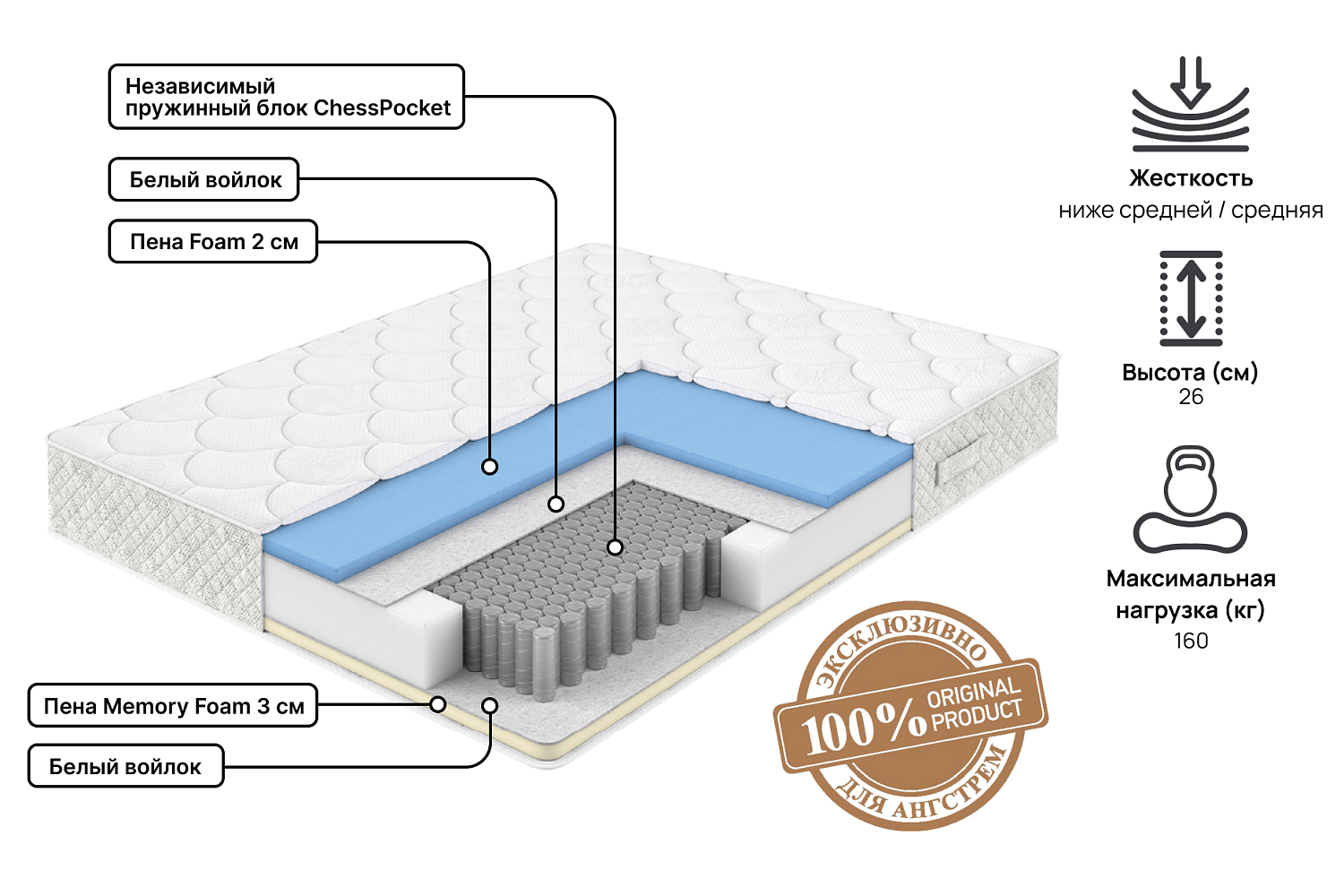 Войлок, Высокоэластичная пена Foam, Независимый пружинный блок ChessPoket, Пена с памятью формы