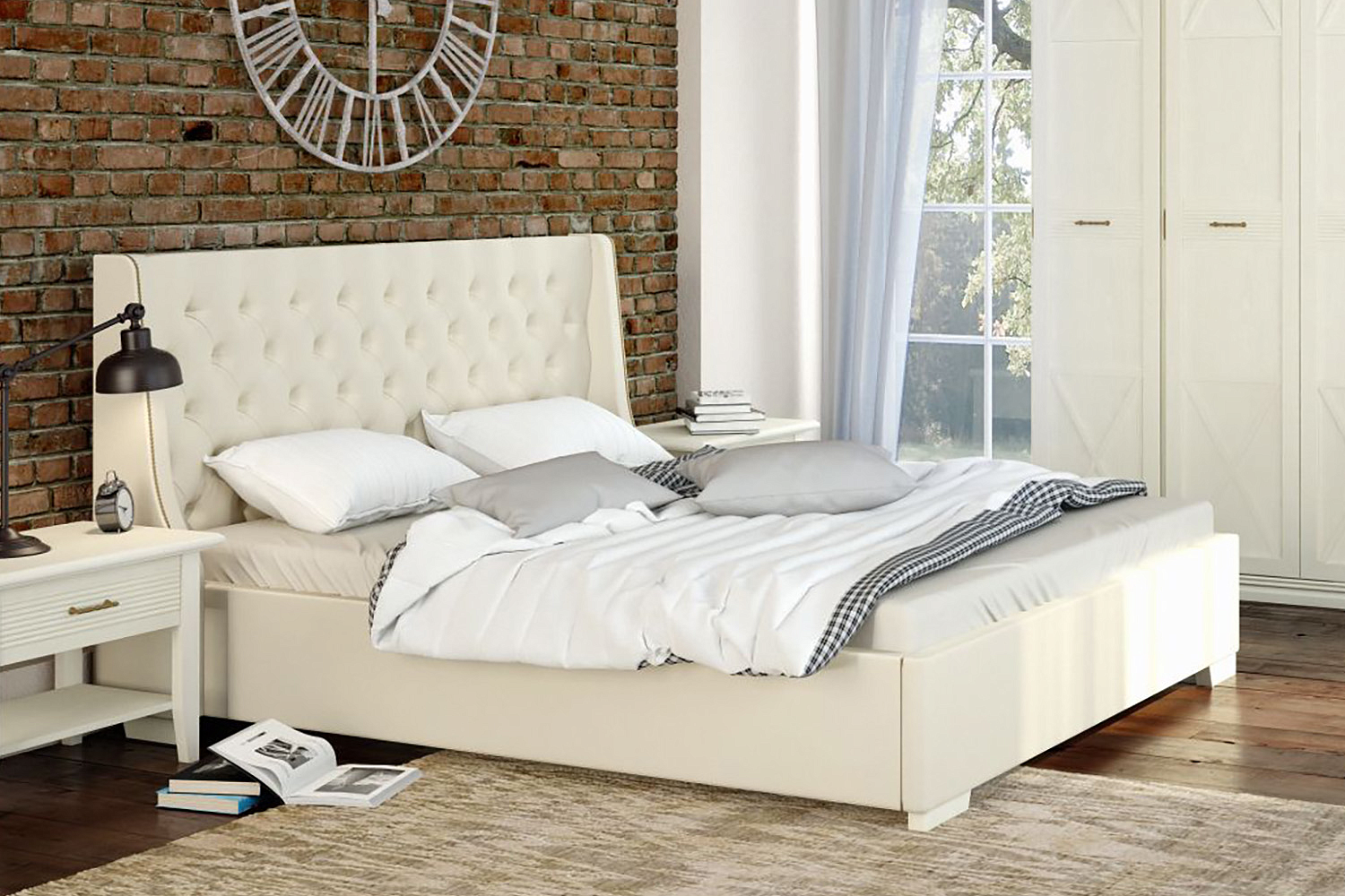 – описание: стиль английский, кантри, неоклассика, размер спального места 160 х 200 см, материал обивки экокожа, назначение для спальни.