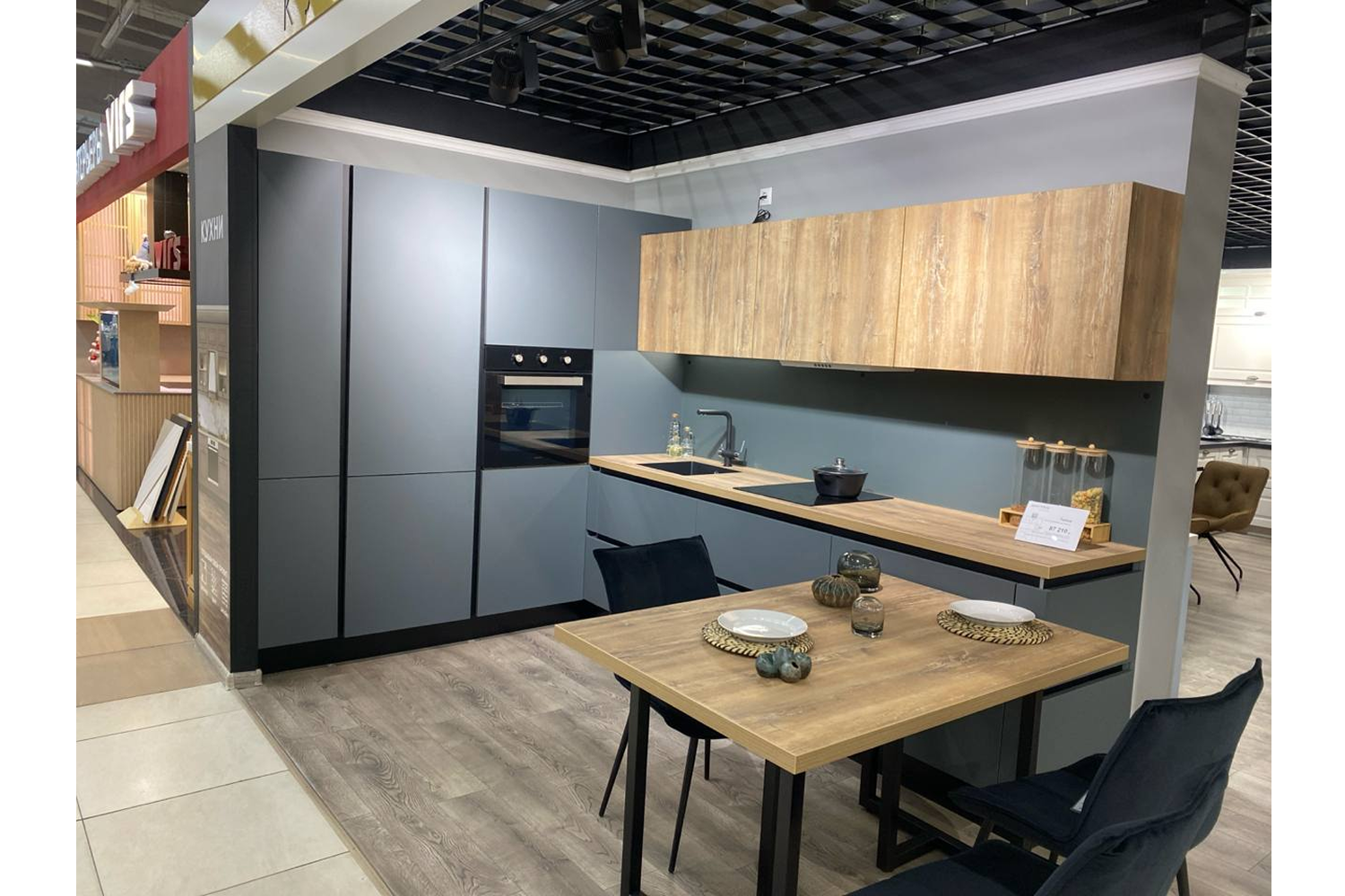 Размеры: ширина 3000 мм, высота 2380 мм, Фасад ЛДСП 16мм, (5,796)(Дуб Галифакс Натуральный, Подъёмный механизм TOP-STAYS SF - H, профиль Gola, Столешница 900 T40 Touch Line, Стекло панель Vitrolan (однотонное) Т6мм, Бутылочница Комфорт, хром MENAGE CONFORT, InnoTech, лоток для столовых приборов 470/800 мм, серебристый, Волшебный уголок COR FLEX Классик с доводчиком на распашной фасад 600 мм VAUTH-SAGEL, фурнитура Хетих